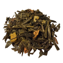 Thé vert, cannelle, amandes râpées, pomme, vanille, orange.